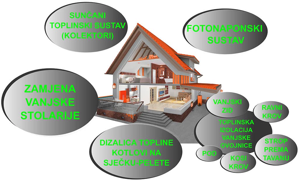 Građanima se sufinancira povećanje toplinske zaštite svih elemenata vanjske ovojnice grijanog prostora: energetska obnova vanjskog zida, krova, stropa, poda; zamjena stolarije.